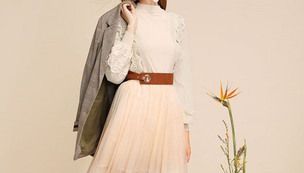 有蕾丝点缀的针织上衣,多了一分飘逸与柔软和感觉,与长纱裙的材质搭配起来十分和谐。杏色长纱裙搭配带蕾丝的针织上衣,十分显示淑女气质。